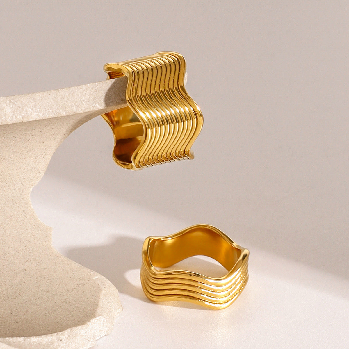 The WaveRib Ring features a distinctive wave-shaped design available in both wide and slim sizes. Its minimalist and stylish form makes it a versatile accessory, perfect for everyday wear while adding a subtle touch of sophistication and individuality.